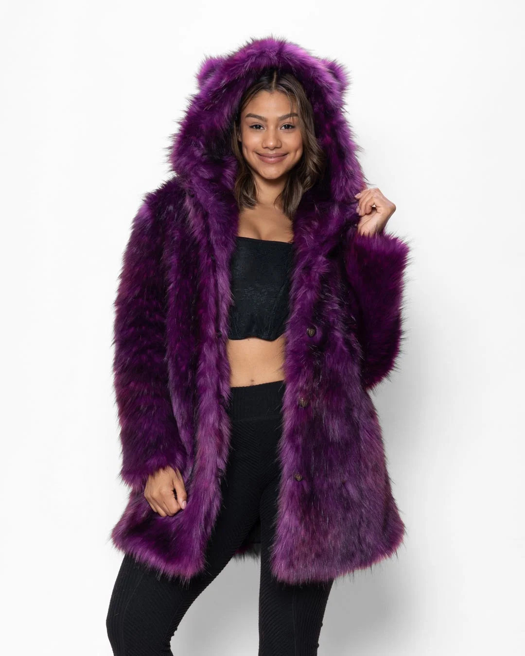 Turn every entrance into a moment with our Classic Purple Faux Fur Coat in Purple Panther, a bold collector-edition favorite making its final return. Crafted from ultra-plush, extra soft, 100% vegan fake fur, in a rich jewel-toned purple, this unisex faux fur jacket features an oversized hood and ears, custom peacoat buttons, and four deep, functional pockets designed for all-night roaming and effortless everyday wear. The relaxed, oversized fit makes it the perfect choice for year-round layering, city strolls, creative gatherings, or lighting up festival nights. Soft, dramatic, and impossible to ignore, this statement coat is made for those who don't blend in, lead with style, confidence, and a little mystery.