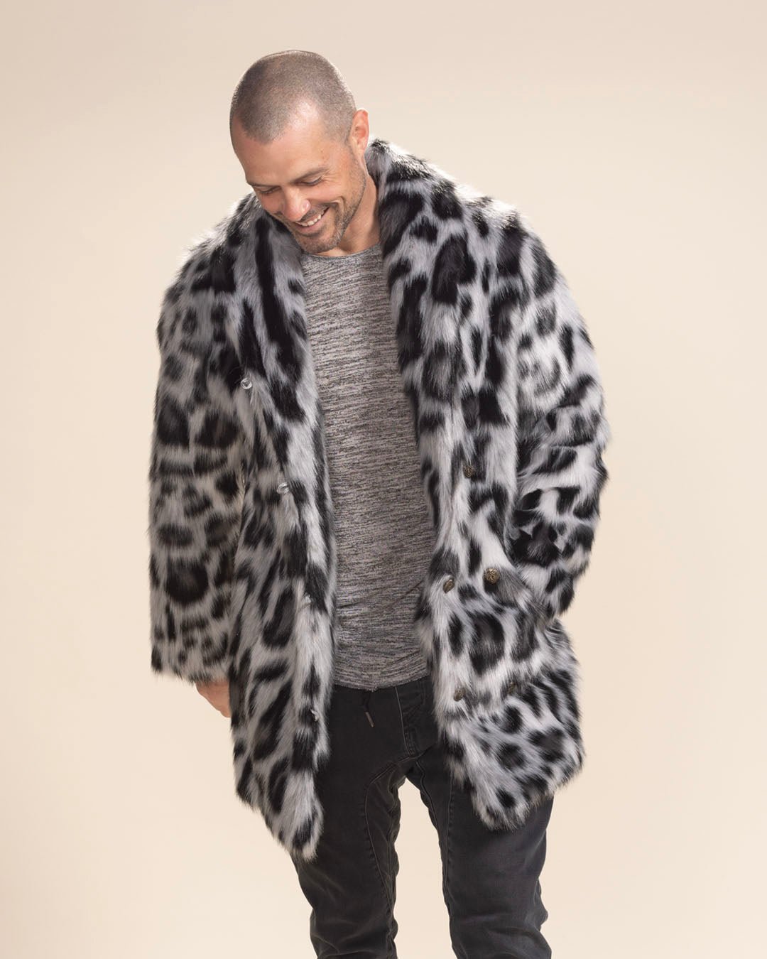 Our Men's Faux Fur Coat in Himalayan Snow Leopard features Bold custom leopard faced buttons, deep side pockets, and a secret inner zipper pocket to hide all your valuables. Perfect for nightlife, everyday prowls, and as festival clothing.