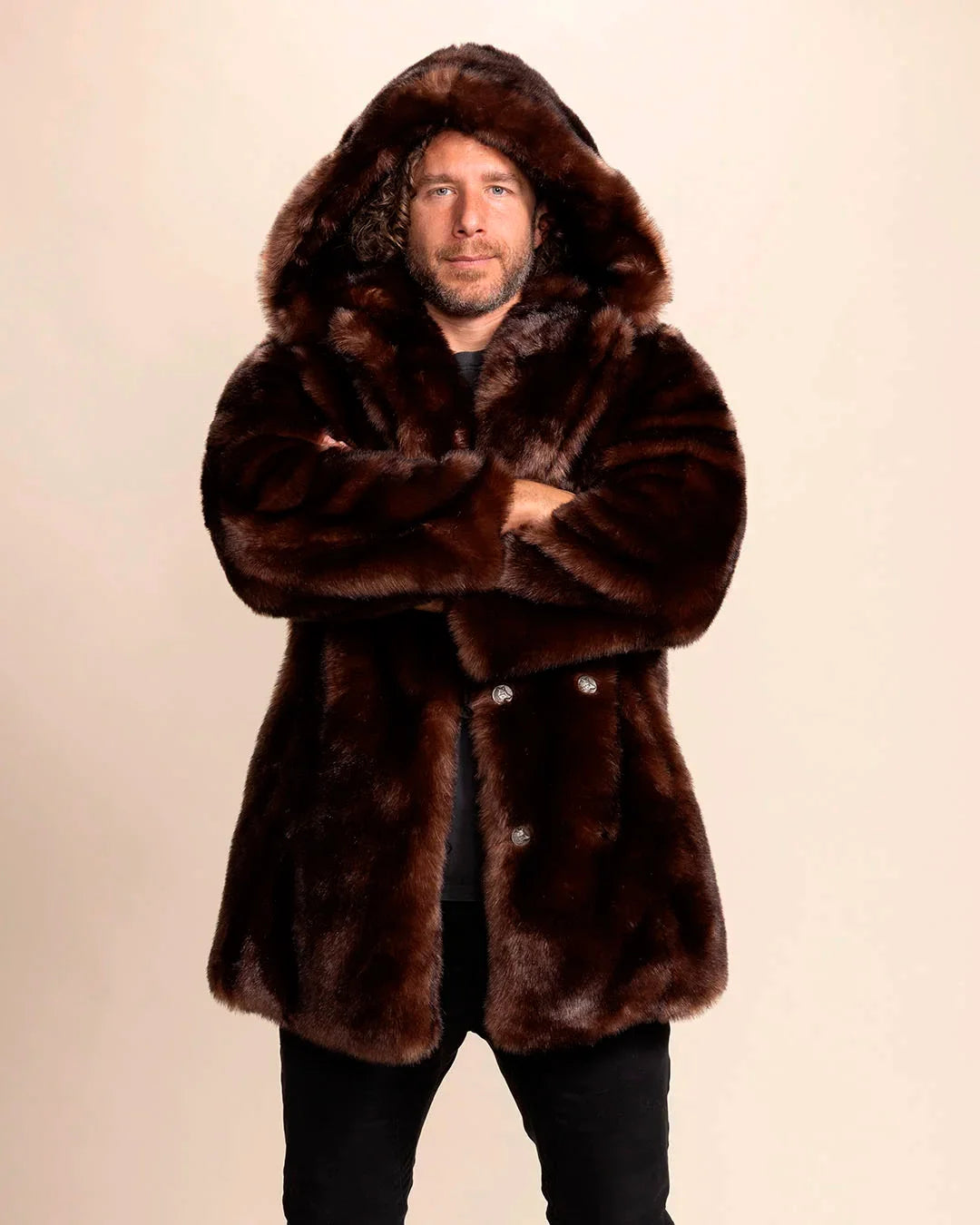 Prowl in comfort and style with the Men's Hooded Faux Fur Coat in Brown Wolf. Featuring premium ultra-soft fake fur in deep, rich mahogany brown with chestnut gradients that bring the alpha energy. Designed with adventure and boldness in mind, this faux fur jacket is festival-ready, everyday-wearable, and guaranteed to get you attention every time you wear it.
