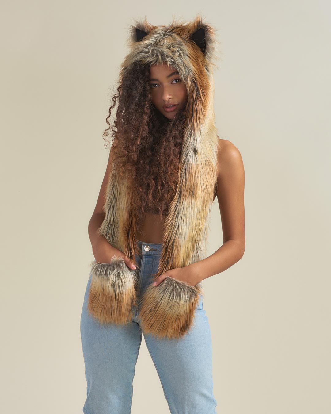 Keep life playful with your own Red Fox faux fur SpiritHood for women. Whether out on the town or getting down at the local music festival, this faux fur hood will make a simple statement – your fierceness is on point! The pawkets keep your paws cozy and provide a place to keep your essentials. You can use the secure stash pocket for your cash and credit cards and keep your funds close. Clever, cozy, and cool AF, this faux fur hood is a year-round fashion MUST.